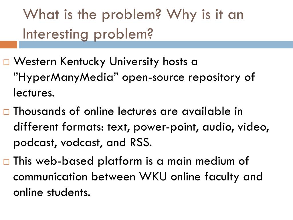 What is the problem? Why is it an Interesting problem? • Western Kentucky University hosts a ”HyperManyMedia” open-source repository of lectures. • Thousands of online lectures are available in different formats: text, power-point, audio, video, podcast, vodcast, and RSS. • This web-based platform is a main medium of communication between WKU online faculty and online students.