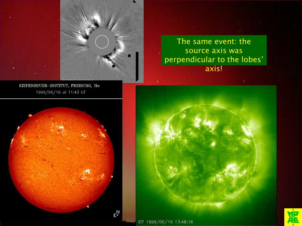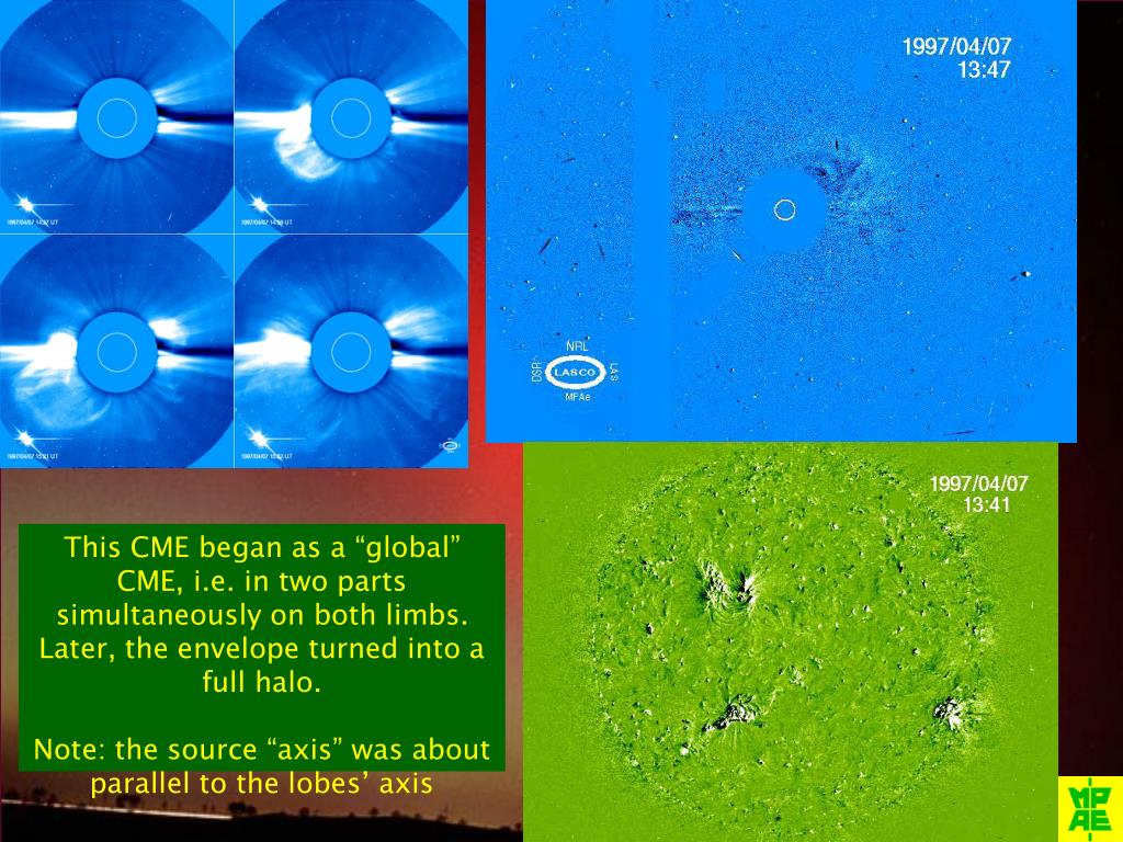 This CME began as a “global” CME, i.e. in two parts simultaneously on both limbs. Later, the envelope turned into a full halo. Note: the source “axis” was about parallel to the lobes’ axis