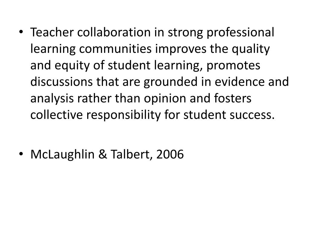 Teacher collaboration in strong professional learning communities improves the quality and equity of student learning, promotes discussions that are grounded in evidence and analysis rather than opinion and fosters collective responsibility for student success. • McLaughlin & Talbert, 2006