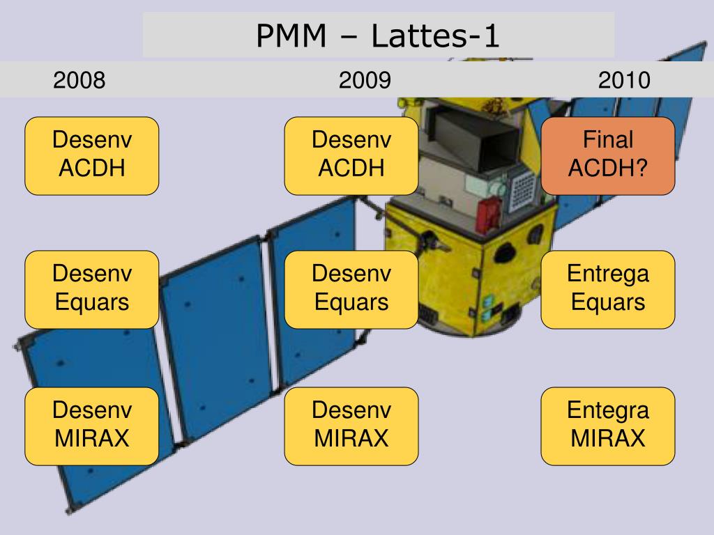 PMM – Lattes-1 2008 2009 2010 Desenv ACDH Desenv ACDH Final ACDH? Desenv Equars Desenv Equars Entrega Equars Desenv MIRAX Desenv MIRAX Entegra MIRAX