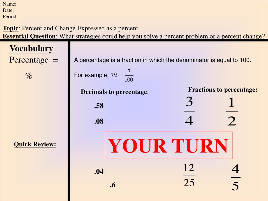 Name: Date: Period: For example, Topic: Percent and Change Expressed as a percent Essential Question: What strategies could help you solve a percent problem or a percent change? Vocabulary: Percentage = % A percentage is a fraction in which the denominator is equal to 100. Fractions to percentage: Decimals to percentage: .58 .08 YOUR TURN Quick Review: .04 .6