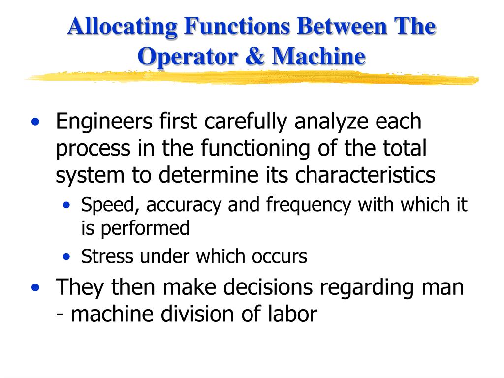 Allocating Functions Between The Operator & Machine • Engineers first carefully analyze each process in the functioning of the total system to determine its characteristics • Speed, accuracy and frequency with which it is performed • Stress under which occurs • They then make decisions regarding man - machine division of labor