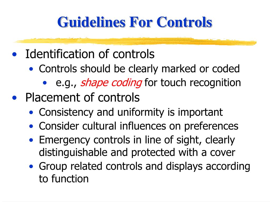 Guidelines For Controls • Identification of controls • Controls should be clearly marked or coded • e.g., shape coding for touch recognition • Placement of controls • Consistency and uniformity is important • Consider cultural influences on preferences • Emergency controls in line of sight, clearly distinguishable and protected with a cover • Group related controls and displays according to function