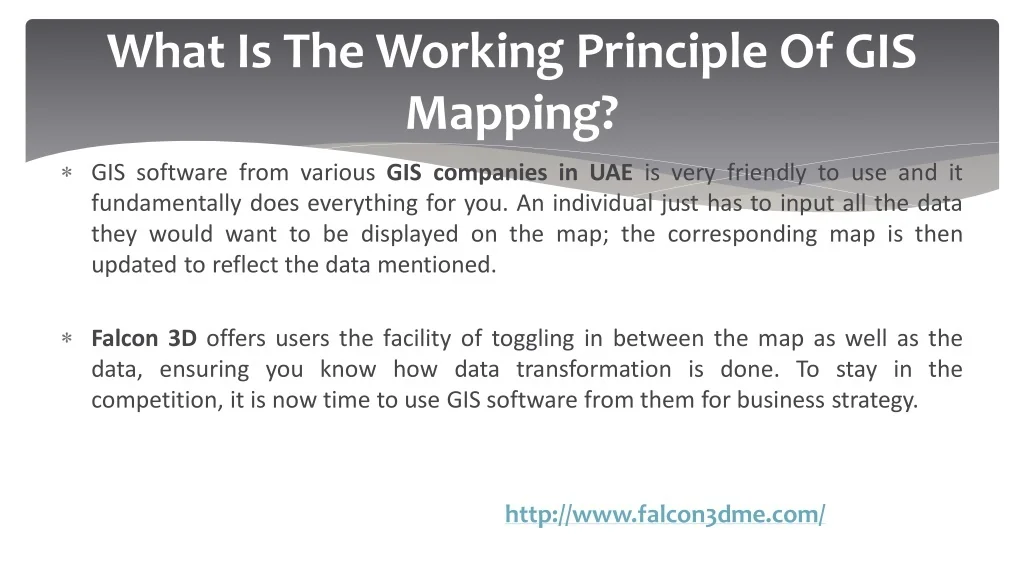 What Is The Working Principle Of GIS Mapping? GIS software from various GIS companies in UAE is very friendly to use and it fundamentally does everything for you. An individual just has to input all the data they would want to be displayed on the map; the corresponding map is then updated to reflect the data mentioned. Falcon 3D offers users the facility of toggling in between the map as well as the data, ensuring you know how data transformation is done. To stay in the competition, it is now time to use GIS software from them for business strategy. http://www.falcon3dme.com/
