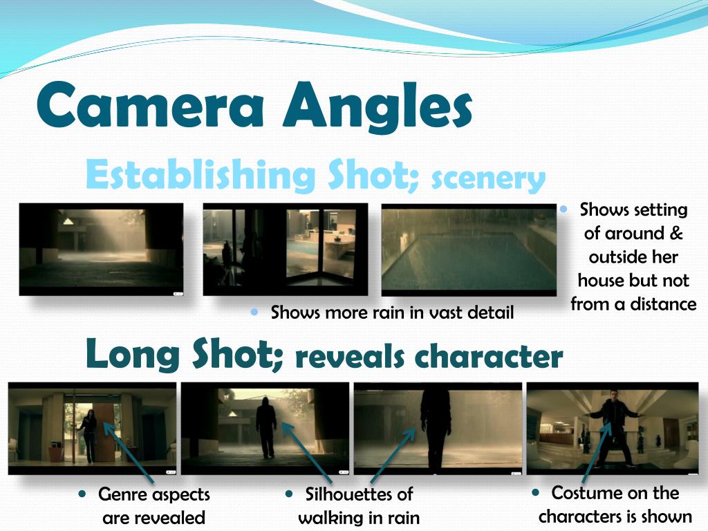 Camera Angles Establishing Shot; scenery • Shows setting of around & outside her house but notfrom a distance Long Shot; reveals character • Shows more rain in vast detail • Costume on the characters is shown • Genre aspects are revealed • Silhouettes of walking in rain