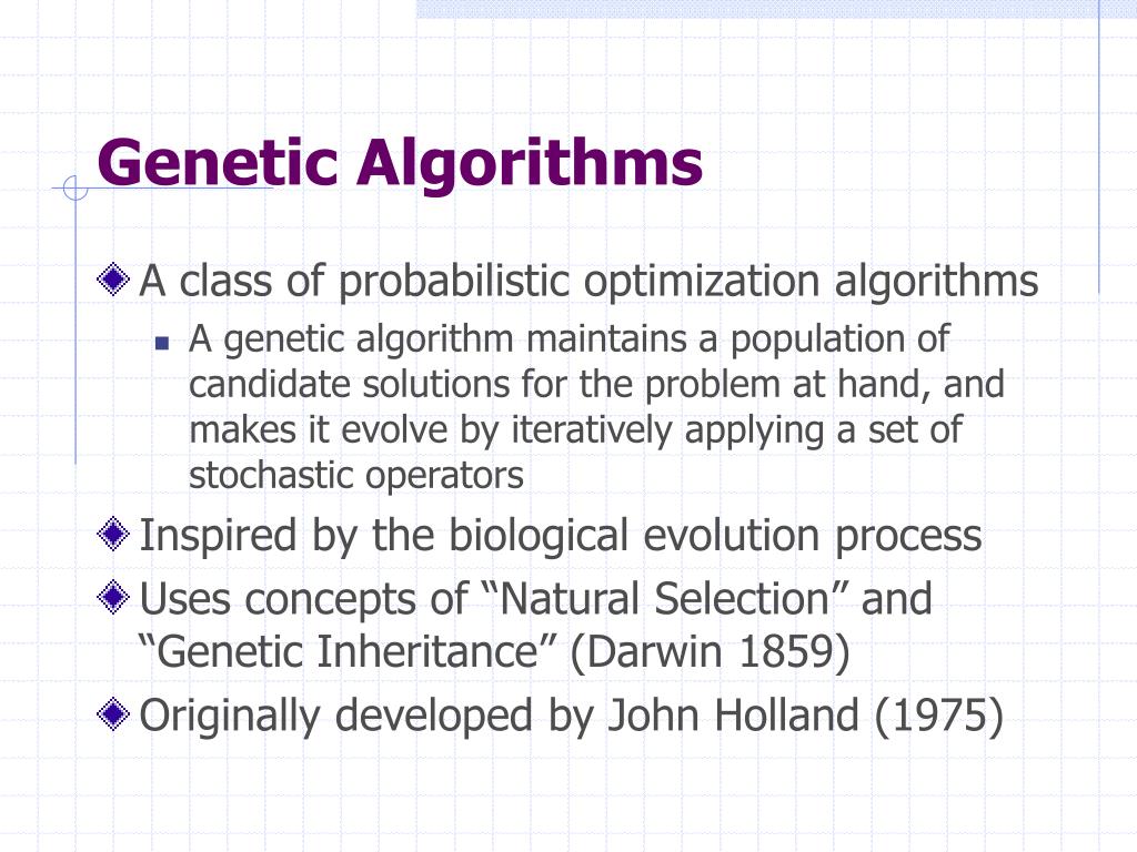 Genetic Algorithms • A class of probabilistic optimization algorithms • A genetic algorithm maintains a population of candidate solutions for the problem at hand, and makes it evolve by iteratively applying a set of stochastic operators • Inspired by the biological evolution process • Uses concepts of “Natural Selection” and “Genetic Inheritance” (Darwin 1859) • Originally developed by John Holland (1975)