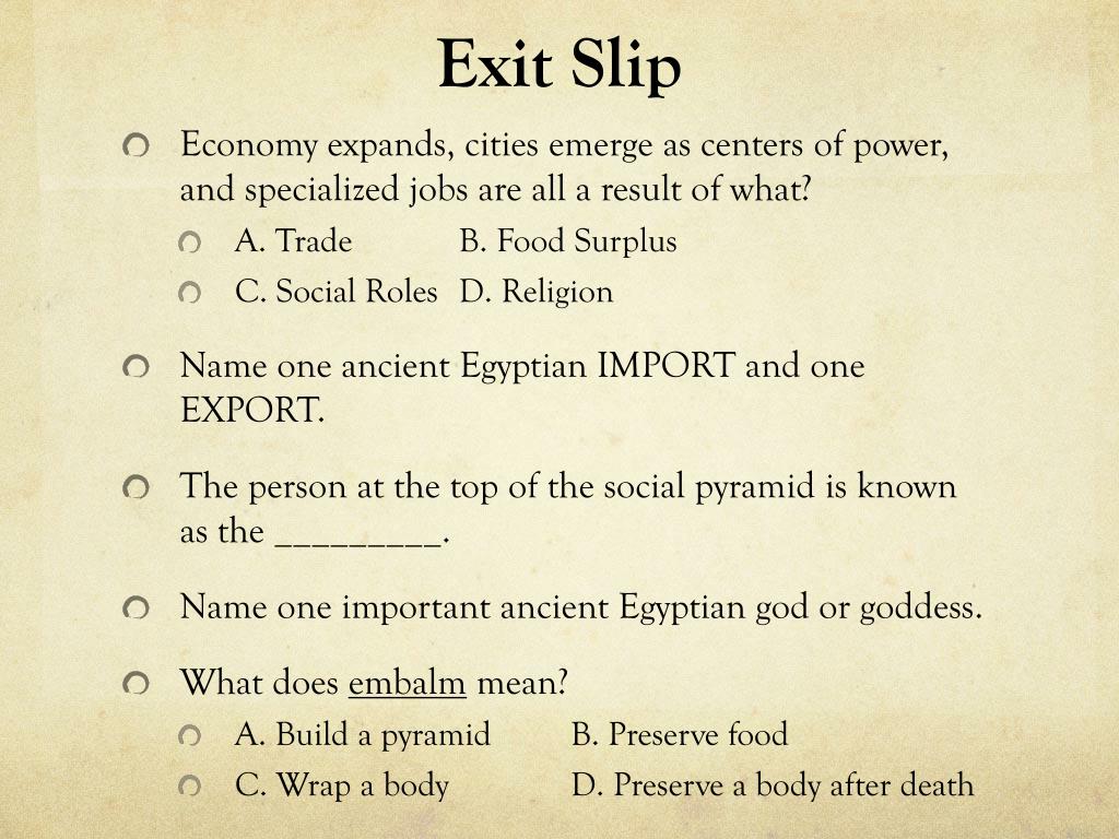Exit Slip • Economy expands, cities emerge as centers of power, and specialized jobs are all a result of what? • A. Trade B. Food Surplus • C. Social Roles D. Religion • Name one ancient Egyptian IMPORT and one EXPORT. • The person at the top of the social pyramid is known as the _________. • Name one important ancient Egyptian god or goddess. • What does embalm mean? • A. Build a pyramid B. Preserve food • C. Wrap a body D. Preserve a body after death