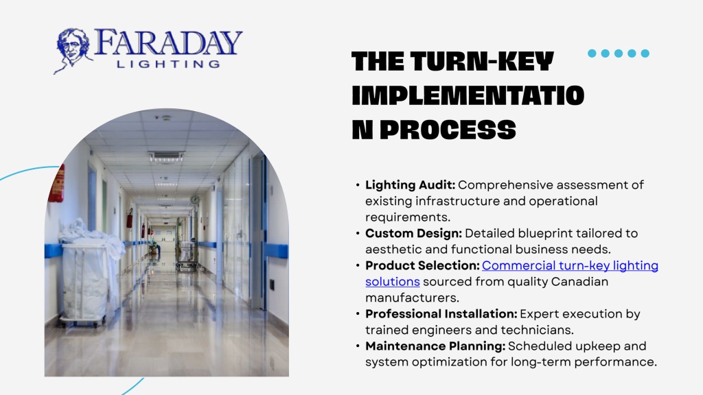 Discover comprehensive end-to-end commercial lighting services through this educational presentation on turn-key lighting solutions. Learn how complete lighting turnkey services streamline your project from design to installation, including energy-efficient options and long-term maintenance partnerships. Perfect for Toronto and GTA businesses seeking reliable commercial lighting solutions that minimize downtime and maximize ROI.<br><br>For More Visit URL: https://faradaylighting.com/turn-key-lighting-solutions-in-toronto-and-the-gta/