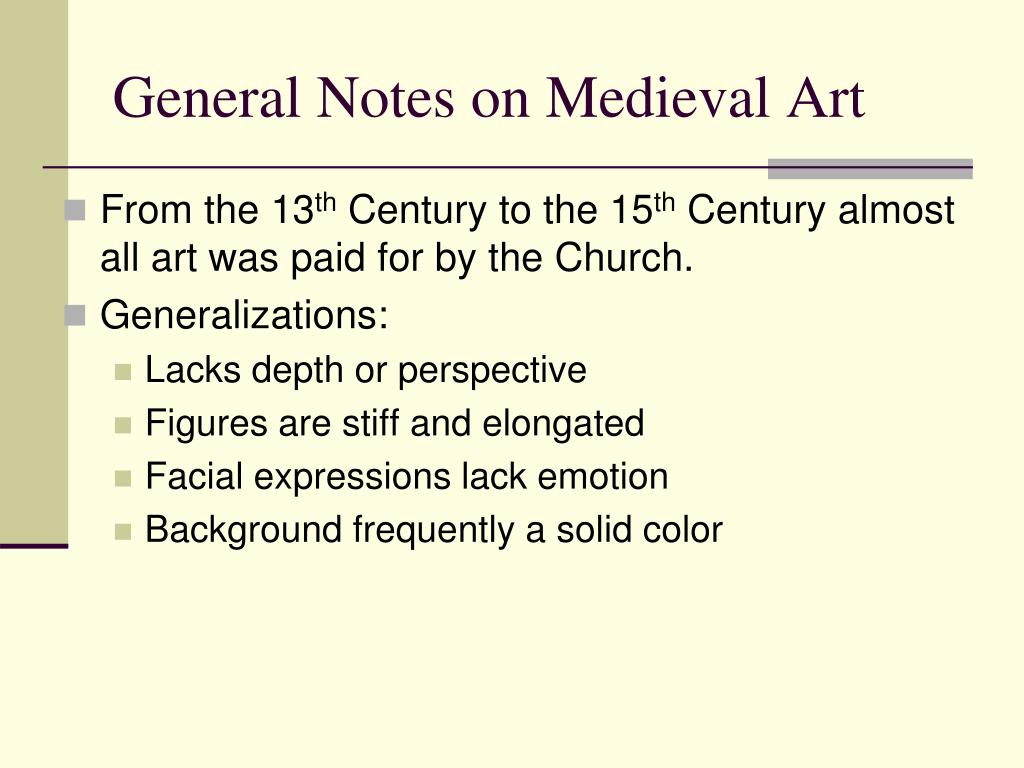 General Notes on Medieval Art • From the 13th Century to the 15th Century almost all art was paid for by the Church. • Generalizations: • Lacks depth or perspective • Figures are stiff and elongated • Facial expressions lack emotion • Background frequently a solid color