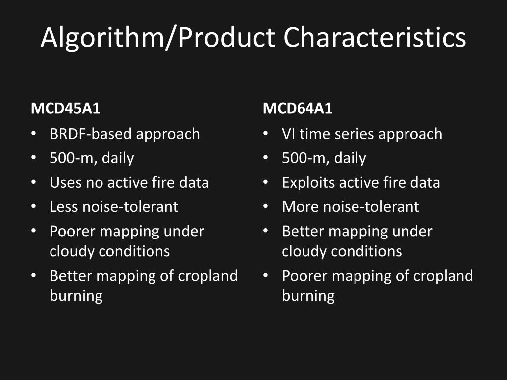 Algorithm/Product Characteristics MCD45A1 MCD64A1 VI time series approach 500-m, daily Exploits active fire data More noise-tolerant Better mapping under cloudy conditions Poorer mapping of cropland burning • BRDF-based approach • 500-m, daily • Uses no active fire data • Less noise-tolerant • Poorer mapping under cloudy conditions • Better mapping of cropland burning