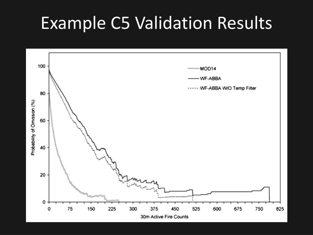 Validation • Use swath (L2) product • Compare Terra MODIS fire masks to 30-m ASTER fire masks • 2500 ASTER scenes • Largely automated • C6 validation process can be initiated at any time
