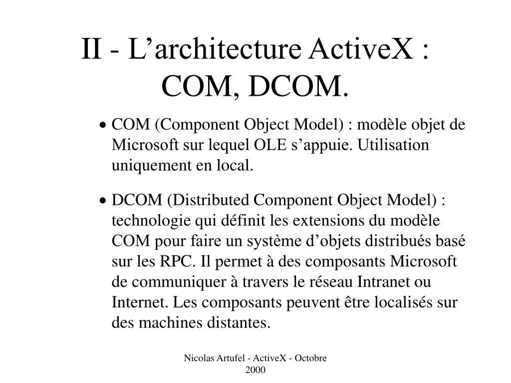 II - L’architecture ActiveX : COM, DCOM. • COM (Component Object Model) : modèle objet de Microsoft sur lequel OLE s’appuie. Utilisation uniquement en local. • DCOM (Distributed Component Object Model) : technologie qui définit les extensions du modèle COM pour faire un système d’objets distribués basé sur les RPC. Il permet à des composants Microsoft de communiquer à travers le réseau Intranet ou Internet. Les composants peuvent être localisés sur des machines distantes. Nicolas Artufel - ActiveX - Octobre 2000