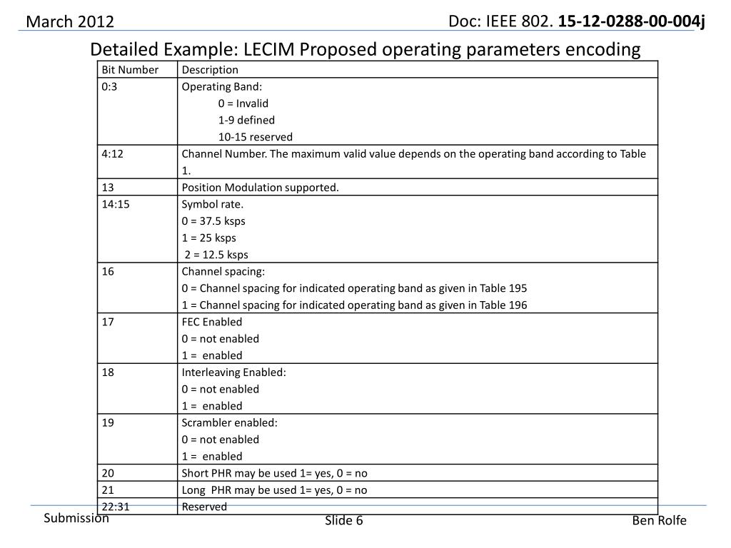 Detailed Example: LECIM Proposed operating parameters encoding Ben Rolfe
