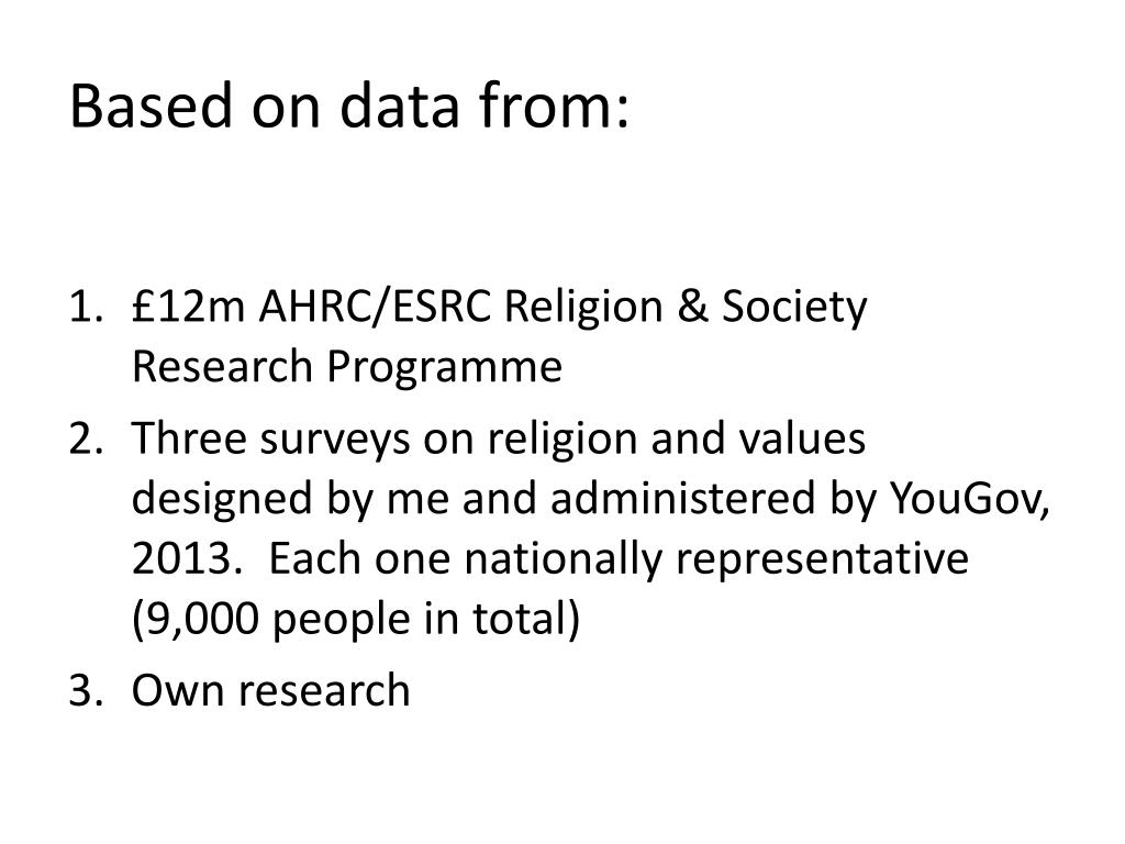Based on data from: • £12m AHRC/ESRC Religion & Society Research Programme • Three surveys on religion and values designed by me and administered by YouGov, 2013. Each one nationally representative (9,000 people in total) • Own research