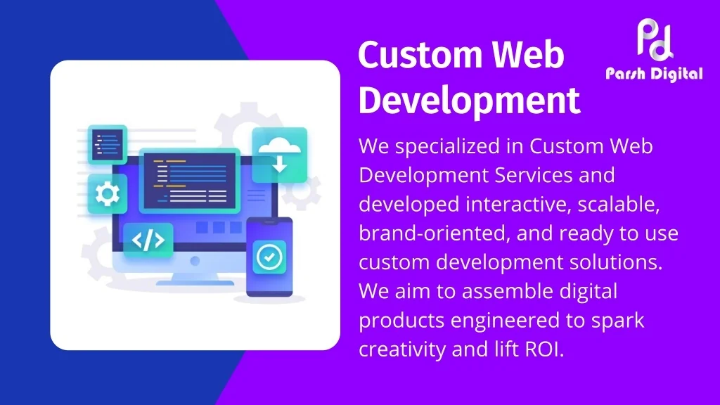 Custom Web Development We specialized in Custom Web Development Services and developed interactive, scalable, brand-oriented, and ready to use custom development solutions. We aim to assemble digital products engineered to spark creativity and lift ROI.