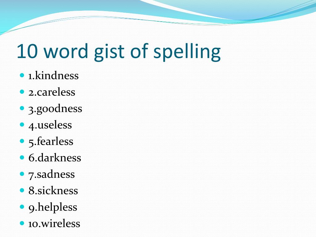 10 word gist of spelling • 1.kindness • 2.careless • 3.goodness • 4.useless • 5.fearless • 6.darkness • 7.sadness • 8.sickness • 9.helpless • 10.wireless