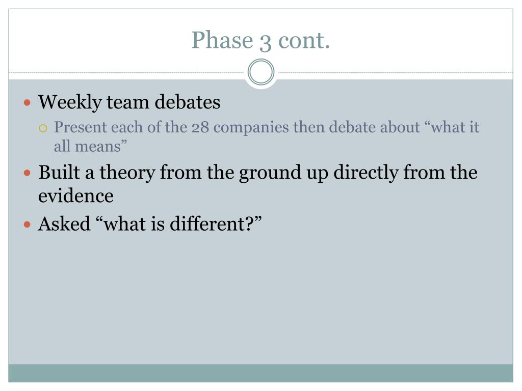 Phase 3 cont. • Weekly team debates • Present each of the 28 companies then debate about “what it all means” • Built a theory from the ground up directly from the evidence • Asked “what is different?”