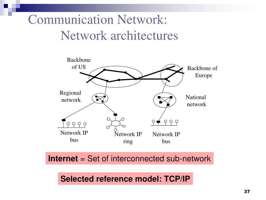 Backbone of US Backbone of Europe Regional network National network Network IPbus Network IPbus Network IPring Communication Network: Network architectures Internet = Set of interconnected sub-network Selected reference model: TCP/IP
