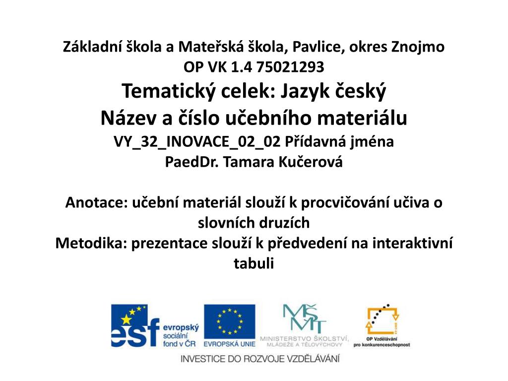 1. Základní škola a Mateřská škola, Pavlice, okres ZnojmoOP VK 1.4 75021293Tematický celek: Jazyk český Název a číslo učebního materiáluVY_32_INOVACE_02_02 Přídavná jménaPaedDr. Tamara KučerováAnotace: učební materiál slouží k procvičování učiva o slovních druzích Metodika: prezentace slouží k předvedení na interaktivní tabuli