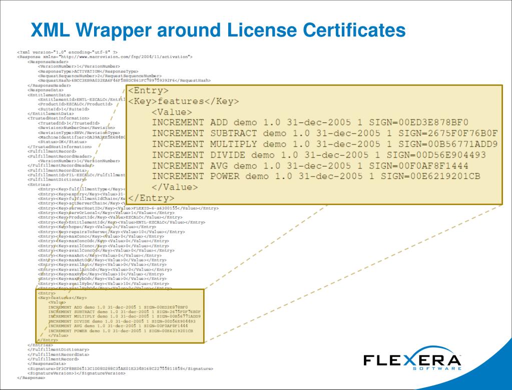 Agenda • Benefits of Trusted Storage • Trusted storage architecture compared to certificate architecture • XML responses compared to license certificates • Report logging implications of trusted storage • Virtualization best practices