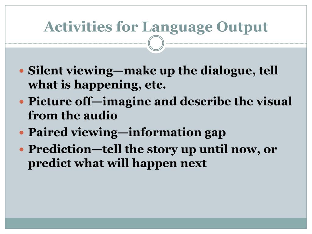 Activities for Language Output Silent viewing—make up the dialogue, tell what is happening, etc. Picture off—imagine and describe the visual from the audio Paired viewing—information gap Prediction—tell the story up until now, or predict what will happen next