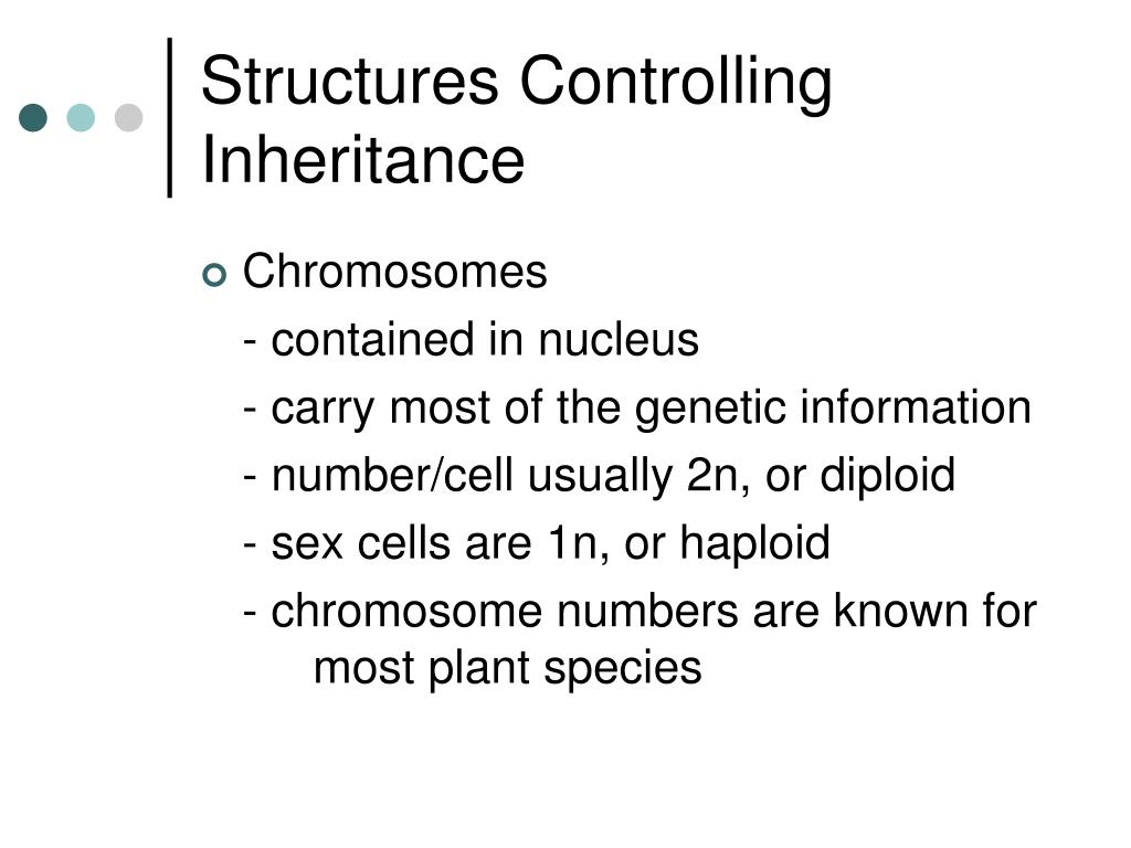 Structures Controlling Inheritance • Chromosomes - contained in nucleus - carry most of the genetic information - number/cell usually 2n, or diploid - sex cells are 1n, or haploid - chromosome numbers are known for most plant species