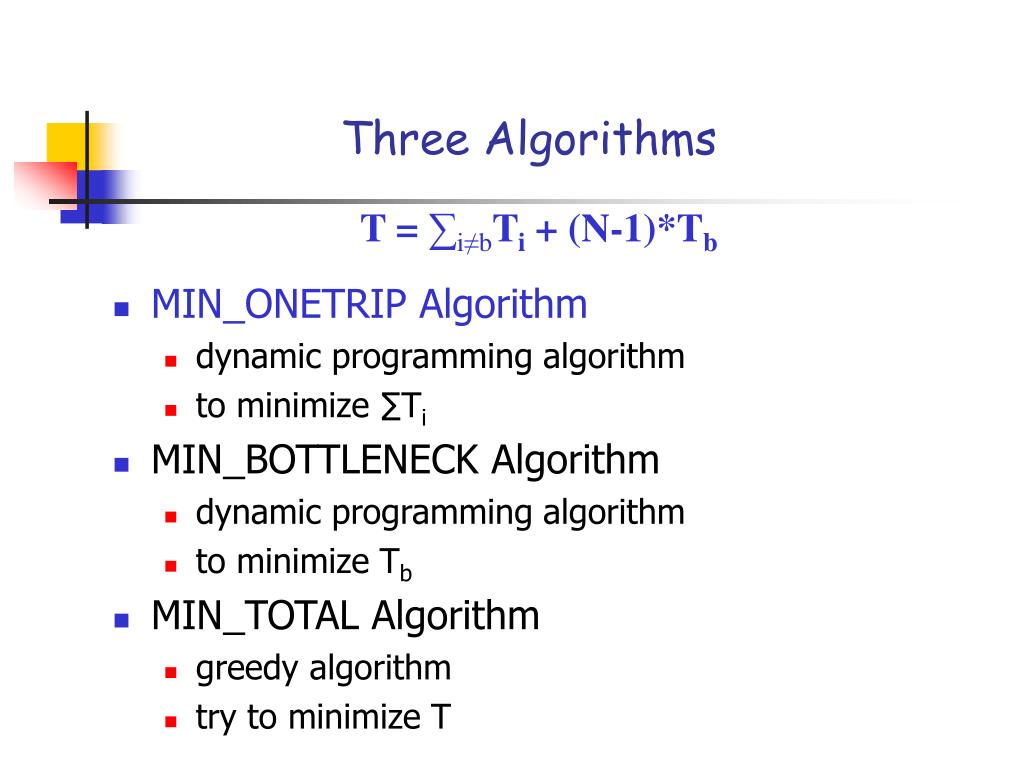 Three Algorithms T = ∑i≠bTi + (N-1)*Tb • MIN_ONETRIP Algorithm • dynamic programming algorithm • to minimize ∑Ti • MIN_BOTTLENECK Algorithm • dynamic programming algorithm • to minimize Tb • MIN_TOTAL Algorithm • greedy algorithm • try to minimize T