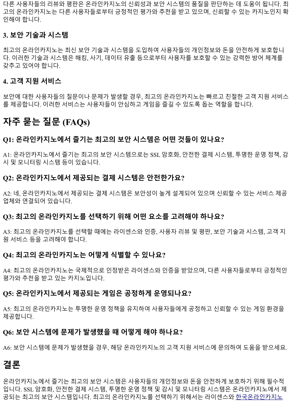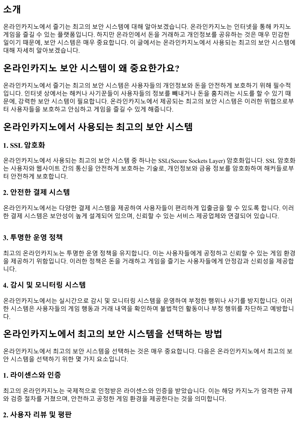 다른사용자들의리뷰와평판은온라인카지노의신뢰성과보안시스템의품질을판단하는데도움이됩니다. 최 고의온라인카지노는다른사용자들로부터긍정적인평가와추천을받고있으며, 신뢰할수있는카지노인지확 인해야합니다. 3. 보안기술과시스템 최고의온라인카지노는최신보안기술과시스템을도입하여사용자들의개인정보와돈을안전하게보호합니 다. 이러한기술과시스템은해킹, 사기, 데이터유출등으로부터사용자를보호할수있는강력한방어체계를 갖추고있어야합니다. 4. 고객지원서비스 보안에대한사용자들의질문이나문제가발생할경우, 최고의온라인카지노는빠르고친절한고객지원서비스 를제공합니다. 이러한서비스는사용자들이안심하고게임을즐길수있도록돕는역할을합니다. 자주묻는질문 (FAQs) Q1: 온라인카지노에서즐기는최고의보안시스템은어떤것들이있나요? A1: 온라인카지노에서즐기는최고의보안시스템으로는 SSL 암호화, 안전한결제시스템, 투명한운영정책, 감 시및모니터링시스템등이있습니다. Q2: 온라인카지노에서제공되는결제시스템은안전한가요? A2: 네, 온라인카지노에서제공되는결제시스템은보안성이높게설계되어있으며신뢰할수있는서비스제공 업체와연결되어있습니다. Q3: 최고의온라인카지노를선택하기위해어떤요소를고려해야하나요? A3: 최고의온라인카지노를선택할때에는라이센스와인증, 사용자리뷰및평판, 보안기술과시스템, 고객지 원서비스등을고려해야합니다. Q4: 최고의온라인카지노는어떻게식별할수있나요? A4: 최고의온라인카지노는국제적으로인정받은라이센스와인증을받았으며, 다른사용자들로부터긍정적인 평가와추천을받고있는카지노입니다. Q5: 온라인카지노에서제공되는게임은공정하게운영되나요? A5: 최고의온라인카지노는투명한운영정책을유지하여사용자들에게공정하고신뢰할수있는게임환경을 제공합니다. Q6: 보안시스템에문제가발생했을때어떻게해야하나요? A6: 보안시스템에문제가발생했을경우, 해당온라인카지노의고객지원서비스에문의하여도움을받으세요. 결론 온라인카지노에서즐기는최고의보안시스템은사용자들의개인정보와돈을안전하게보호하기위해필수적 입니다. SSL 암호화, 안전한결제시스템, 투명한운영정책및감시및모니터링시스템은온라인카지노에서제 공되는최고의보안시스템입니다. 최고의온라인카지노를선택하기위해서는라이센스와한국온라인카지노