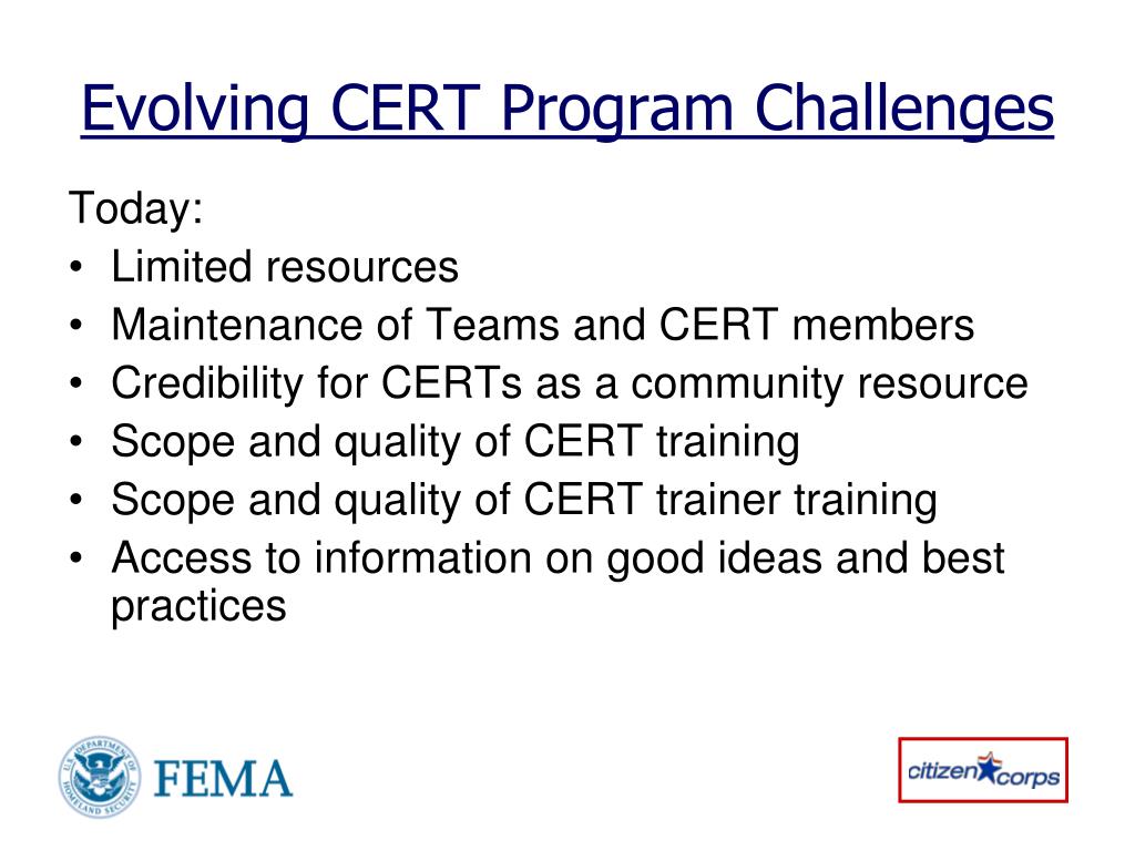 Evolving CERT Program Challenges Today: • Limited resources • Maintenance of Teams and CERT members • Credibility for CERTs as a community resource • Scope and quality of CERT training • Scope and quality of CERT trainer training • Access to information on good ideas and best practices