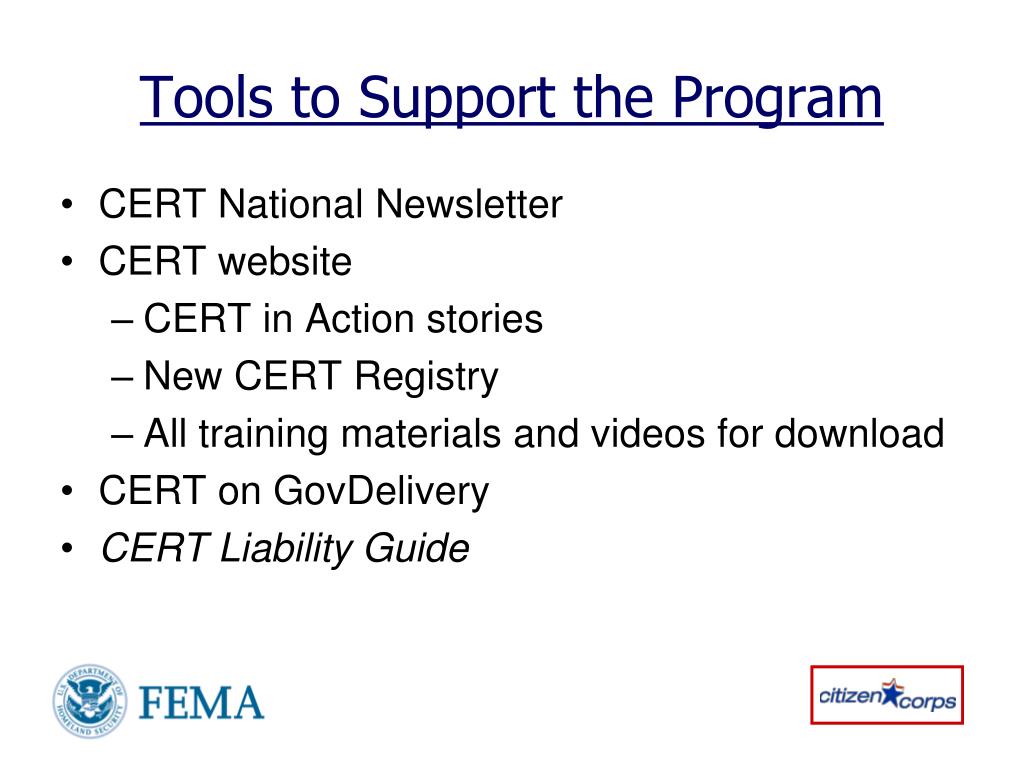 Tools to Support the Program • CERT National Newsletter • CERT website • CERT in Action stories • New CERT Registry • All training materials and videos for download • CERT on GovDelivery • CERT Liability Guide
