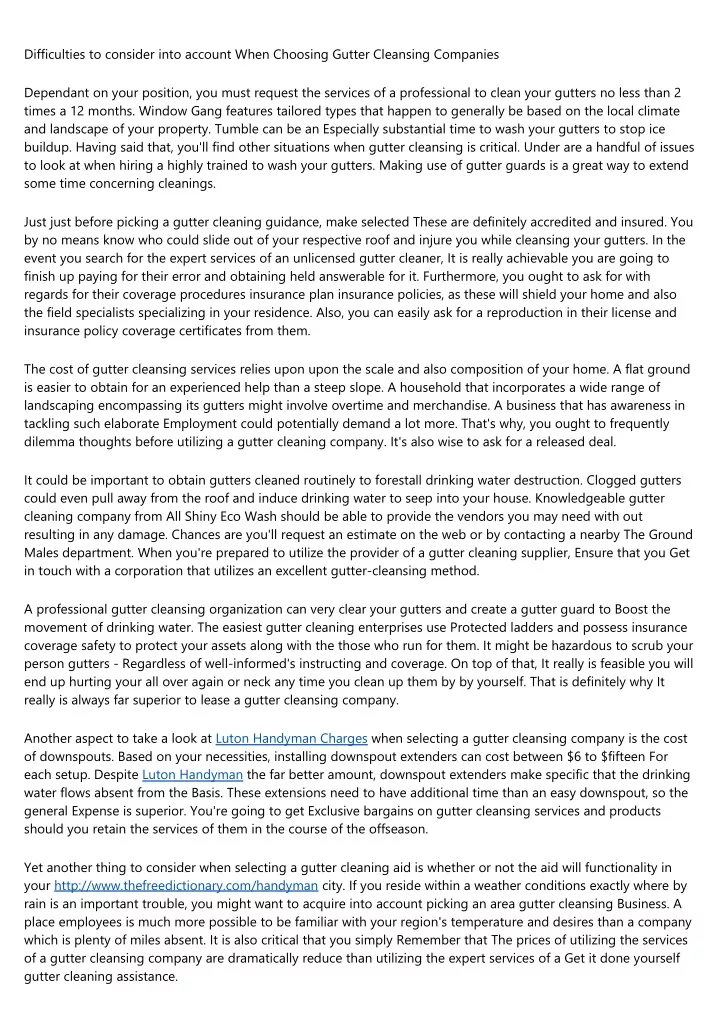 Things to Consider When Hiring Gutter Cleaning Services<br>Depending on your area, you should hire a professional to clean your gutters at least twice a year. Window Gang offers customized plans that are based on the climate and landscape of your home. Fall is an especially important time to clean your gutters to prevent ice buildup. However, there are other times when gutter cleaning is necessary. Below are some things to consider when hiring a professional to clean your gutters. Using gutter guards is a good way to extend the time between cleanings.<br><br>Before hiring a gutter cleaning service, ens