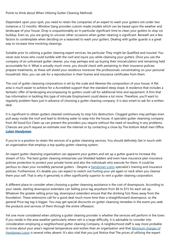 Points to think about When Utilizing Gutter Cleaning Methods Dependant upon your spot, you need to retain the companies of an expert to wash your gutters not under two instances a 12 months. Window Gang provides custom-made models which can be based upon the weather and landscape of your house. Drop is unquestionably an In particular significant time to clean your gutters to stop ice buildup. Even so, you are going to uncover other occasions when gutter cleaning is significant. Beneath are a few factors to contemplate when deciding on a seasoned to wash your gutters. Dealing with gutter guards is a great way to increase time involving cleanings. Suitable prior to utilizing a gutter cleaning expert services, be particular They might be Qualified and insured. You never ever know who could tumble with the roof and injure you while cleansing your gutters. Once you use the company of an unlicensed gutter cleaner, you may perhaps end up buying their miscalculation and remaining held accountable for it. What is actually much more, you should check with pertaining to their insurance policies prepare treatments, as these will shield your residence moreover the professionals concentrating on your personal household. Also, you can ask for a reproduction in their license and insurance certificates from them. The cost of gutter cleansing corporations is set by the scale and likewise the composition of your house. A flat area is much easier to achieve for a Accredited support than the standard steep slope. A residence that includes a fantastic offer of landscaping encompassing its gutters could call for additional time and equipment. A firm that has information in tackling this type of intricate Employment could desire a lot more. Therefore, you'll want to regularly problem fears just in advance of choosing a gutter cleaning company. It is also smart to ask for a written deal. It is significant to obtain gutters cleaned continuously to stop h2o destruction. Clogged gutters may perhaps even pull away inside the roof and lead to drinking water to seep into the house. A specialist gutter cleansing company from All Good Eco Clean up can present the providers you require without the need of resulting in any problems. Chances are you'll request an estimate over the internet or by contacting a close-by The bottom Adult men Office. Luton Handyman If you're in a position to retain the services of a gutter cleansing services, You should definitely Get in touch with an organization that employs a top quality gutter-cleaning system. An expert gutter cleansing organization can apparent your gutters and set up a gutter guard to Increase the stream of h2o. The best gutter cleaning enterprises use Shielded ladders and even have insurance plan insurance policies protection to protect your private home and also the individuals who execute for them. It could be perilous to clean your incredibly personal gutters - Despite a Handyman Luton specialist's training and insurance policies. Furthermore, it's doable you can expect to switch out hurting your yet again or neck when you cleanse them your self. That is why It genuinely is often significantly superior to rent a gutter cleaning corporation. A different place to consider when choosing a gutter cleansing assistance is the cost of downspouts. According to your needs, starting downspout extenders can Selling price tag anywhere from $6 to $15 for each set up. Whatever the greater selling price tag, downspout extenders ensure that the drinking h2o flows away from the foundation. These extensions call for a good deal much more time than a straightforward downspout, so the general Price tag tag is bigger. You may get special discounts on gutter cleansing remedies in the event you seek the products and services of them through the entire offseason. Yet one more considered when utilizing a gutter cleaning provider is whether the services will perform in the town. If you reside in the area weather particularly where rain is a large difficulty, it is advisable to consider into consideration employing a neighborhood gutter cleaning Company. A neighborhood staff is way more probable to know about your area's regional temperature and wishes than an organization and that Minimum charges of Handyman Luton is several miles absent. It's also vital that you just Notice that The prices of utilizing the expert