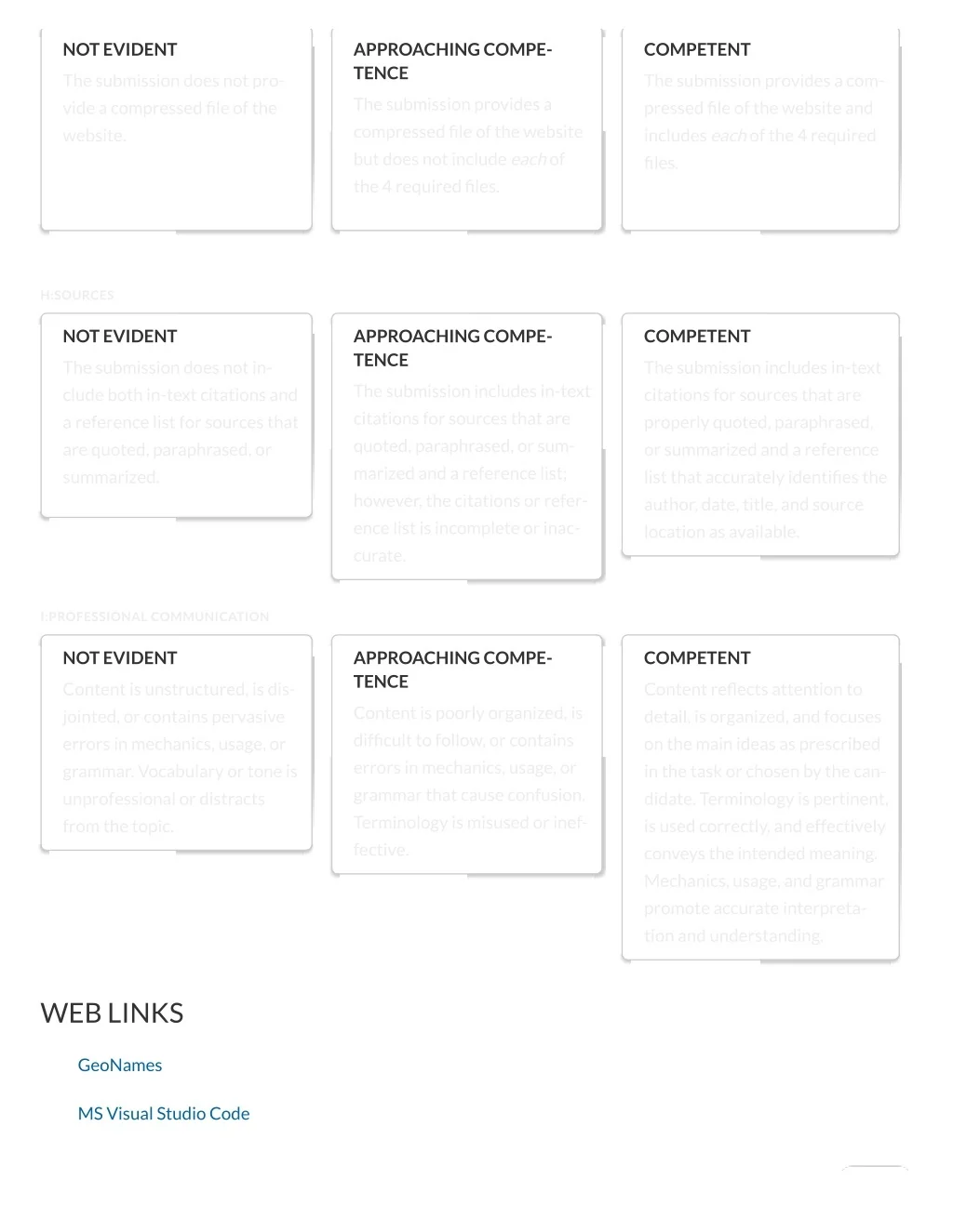 NOT EVIDENT APPROACHING COMPE- TENCE COMPETENT The submission does not pro- vide a compressed file of the website. The submission provides a com- pressed file of the website and includes each of the 4 required files. The submission provides a compressed file of the website but does not include each of the 4 required files. H:SOURCES NOT EVIDENT APPROACHING COMPE- TENCE COMPETENT The submission does not in- clude both in-text citations and a reference list for sources that are quoted, paraphrased, or summarized. The submission includes in-text citations for sources that are properly quoted, paraphrased, or summarized and a reference list that accurately identifies the author, date, title, and source location as available. The submission includes in-text citations for sources that are quoted, paraphrased, or sum- marized and a reference list; however, the citations or refer- ence list is incomplete or inac- curate. I:PROFESSIONAL COMMUNICATION NOT EVIDENT APPROACHING COMPE- TENCE COMPETENT Content is unstructured, is dis- jointed, or contains pervasive errors in mechanics, usage, or grammar. Vocabulary or tone is unprofessional or distracts from the topic. Content reflects attention to detail, is organized, and focuses on the main ideas as prescribed in the task or chosen by the can- didate. Terminology is pertinent, is used correctly, and effectively conveys the intended meaning. Mechanics, usage, and grammar promote accurate interpreta- tion and understanding. Content is poorly organized, is difficult to follow, or contains errors in mechanics, usage, or grammar that cause confusion. Terminology is misused or inef- fective. WEB LINKS GeoNames MS Visual Studio Code