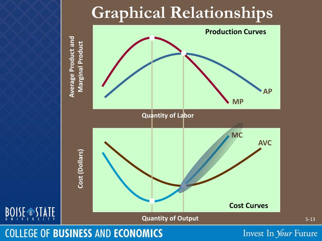 Average Product and Marginal Product Cost (Dollars) Graphical Relationships Production Curves AP MP Quantity of Labor MC AVC Cost Curves Quantity of Output 5-13