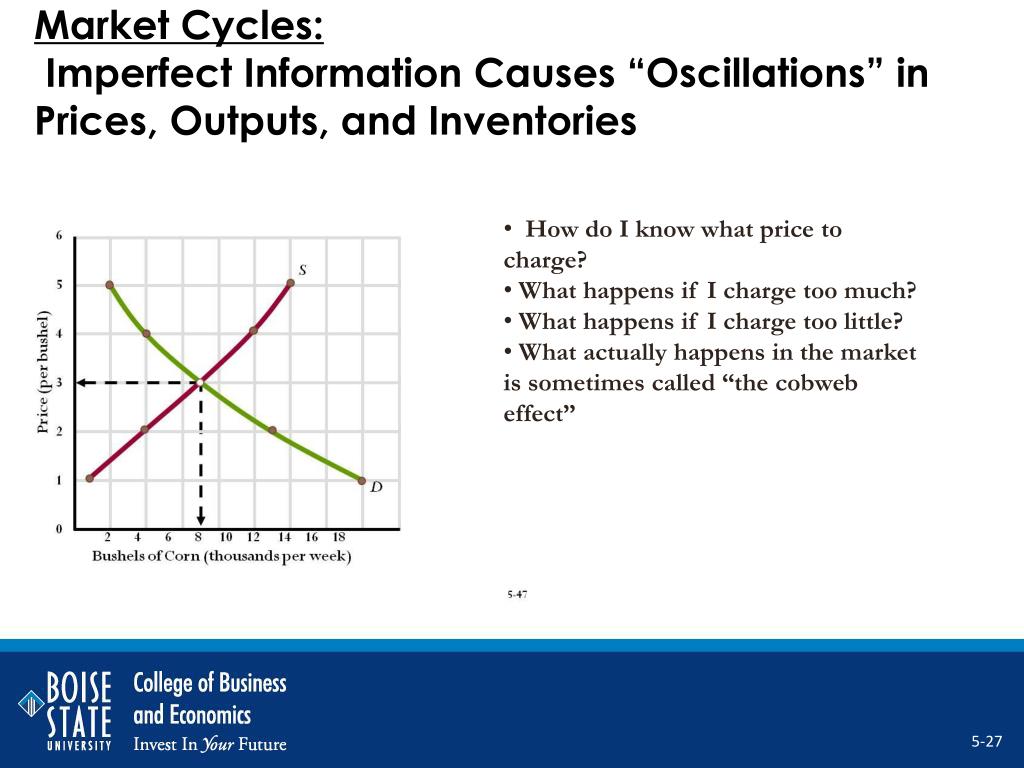 Market Cycles: Imperfect Information Causes “Oscillations” in Prices, Outputs, and Inventories • How do I know what price to charge? • What happens if I charge too much? • What happens if I charge too little? • What actually happens in the market is sometimes called “the cobweb effect” 5-27