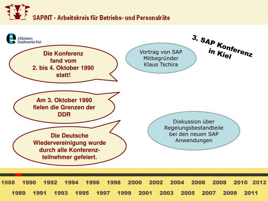 3. SAP Konferenz in Kiel Vortrag von SAP Mitbegründer Klaus Tschira Die Konferenz fand vom 2. bis 4. Oktober 1990 statt! Am 3. Oktober 1990 fielen die Grenzen der DDR Diskussion über Regelungsbestandteile bei den neuen SAP Anwendungen Die Deutsche Wiedervereinigung wurde durch alle Konferenz-teilnehmer gefeiert. 1988 1990 1990 1992 1992 1994 1994 1996 1996 1998 1998 2000 2000 2002 2002 2004 2004 2006 2006 2008 2008 2010 2010 2012 1989 1989 1991 1991 1993 1993 1995 1995 1997 1997 1999 1999 2001 2001 2003 2003 2005 2005 2007 2007 2009 2009 2011 2011