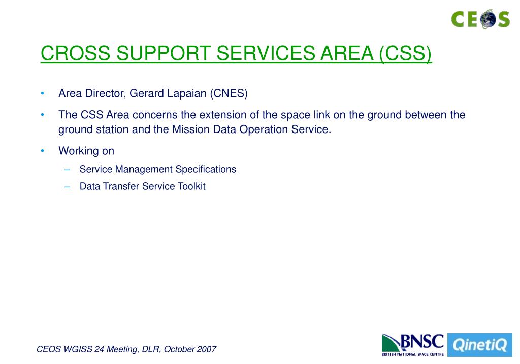 CROSS SUPPORT SERVICES AREA (CSS) • Area Director, Gerard Lapaian (CNES) • The CSS Area concerns the extension of the space link on the ground between the ground station and the Mission Data Operation Service. • Working on • Service Management Specifications • Data Transfer Service Toolkit