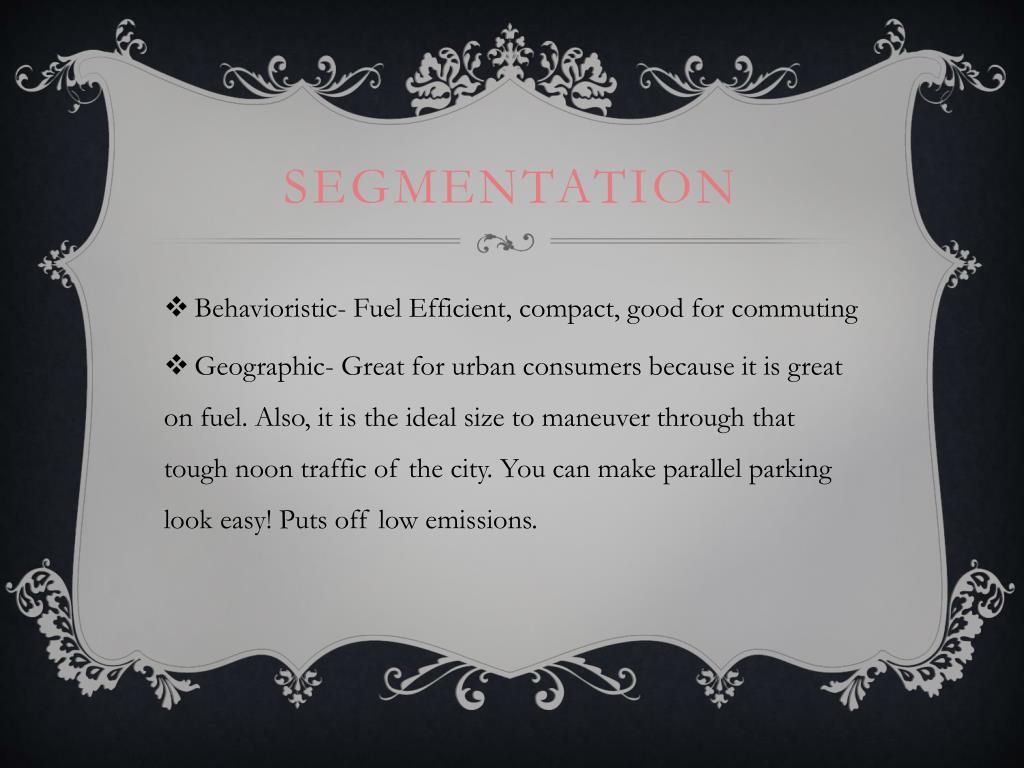 Segmentation • Behavioristic- Fuel Efficient, compact, good for commuting • Geographic- Great for urban consumers because it is great on fuel. Also, it is the ideal size to maneuver through that tough noon traffic of the city. You can make parallel parking look easy! Puts off low emissions.