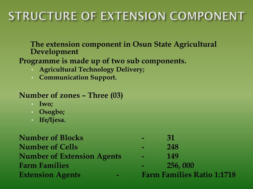 STRUCTURE OF EXTENSION COMPONENT The extension component in Osun State Agricultural Development Programme is made up of two sub components. • Agricultural Technology Delivery; • Communication Support. Number of zones – Three (03) • Iwo; • Osogbo; • Ife/Ijesa. Number of Blocks - 31 Number of Cells - 248 Number of Extension Agents - 149 Farm Families - 256, 000 Extension Agents - Farm Families Ratio 1:1718