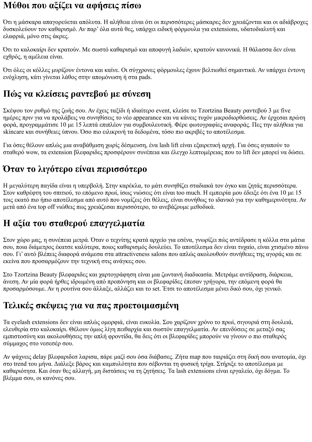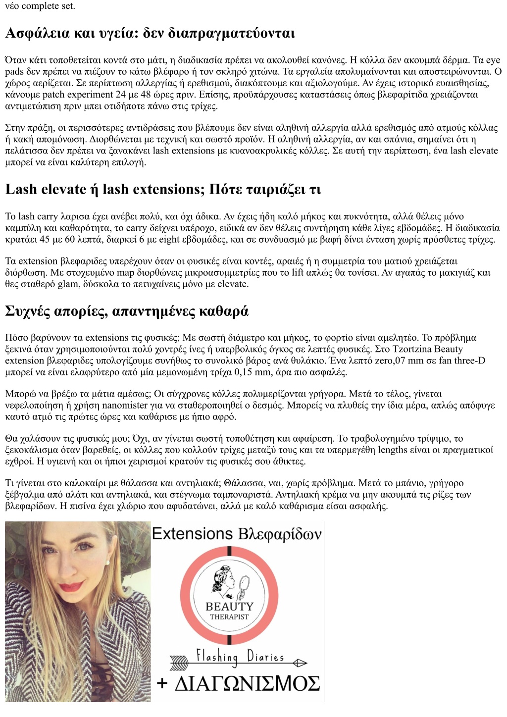 νέο complete set. Ασφάλεια και υγεία: δεν διαπραγματεύονται Όταν κάτι τοποθετείται κοντά στο μάτι, η διαδικασία πρέπει να ακολουθεί κανόνες. Η κόλλα δεν ακουμπά δέρμα. Τα eye pads δεν πρέπει να πιέζουν το κάτω βλέφαρο ή τον σκληρό χιτώνα. Τα εργαλεία απολυμαίνονται και αποστειρώνονται. Ο χώρος αερίζεται. Σε περίπτωση αλλεργίας ή ερεθισμού, διακόπτουμε και αξιολογούμε. Αν έχεις ιστορικό ευαισθησίας, κάνουμε patch experiment 24 με 48 ώρες πριν. Επίσης, προϋπάρχουσες καταστάσεις όπως βλεφαρίτιδα χρειάζονται αντιμετώπιση πριν μπει οτιδήποτε πάνω στις τρίχες. Στην πράξη, οι περισσότερες αντιδράσεις που βλέπουμε δεν είναι αληθινή αλλεργία αλλά ερεθισμός από ατμούς κόλλας ή κακή απομόνωση. Διορθώνεται με τεχνική και σωστό προϊόν. Η αληθινή αλλεργία, αν και σπάνια, σημαίνει ότι η πελάτισσα δεν πρέπει να ξανακάνει lash extensions με κυανοακρυλικές κόλλες. Σε αυτή την περίπτωση, ένα lash elevate μπορεί να είναι καλύτερη επιλογή. Lash elevate ή lash extensions; Πότε ταιριάζει τι Το lash carry λαρισα έχει ανέβει πολύ, και όχι άδικα. Αν έχεις ήδη καλό μήκος και πυκνότητα, αλλά θέλεις μόνο καμπύλη και καθαρότητα, το carry δείχνει υπέροχο, ειδικά αν δεν θέλεις συντήρηση κάθε λίγες εβδομάδες. Η διαδικασία κρατάει 45 με 60 λεπτά, διαρκεί 6 με eight εβδομάδες, και σε συνδυασμό με βαφή δίνει ένταση χωρίς πρόσθετες τρίχες. Τα extension βλεφαριδες υπερέχουν όταν οι φυσικές είναι κοντές, αραιές ή η συμμετρία του ματιού χρειάζεται διόρθωση. Με στοχευμένο map διορθώνεις μικροασυμμετρίες που το lift απλώς θα τονίσει. Αν αγαπάς το μακιγιάζ και θες σταθερό glam, δύσκολα το πετυχαίνεις μόνο με elevate. Συχνές απορίες, απαντημένες καθαρά Πόσο βαρύνουν τα extensions τις φυσικές; Με σωστή διάμετρο και μήκος, το φορτίο είναι αμελητέο. Το πρόβλημα ξεκινά όταν χρησιμοποιούνται πολύ χοντρές ίνες ή υπερβολικός όγκος σε λεπτές φυσικές. Στο Tzortzina Beauty extension βλεφαριδες υπολογίζουμε συνήθως το συνολικό βάρος ανά θυλάκιο. Ένα λεπτό zero,07 mm σε fan three-D μπορεί να είναι ελαφρύτερο από μία μεμονωμένη τρίχα 0,15 mm, άρα πιο ασφαλές. Μπορώ να βρέξω τα μάτια αμέσως; Οι σύγχρονες κόλλες πολυμερίζονται γρήγορα. Μετά το τέλος, γίνεται νεφελοποίηση ή χρήση nanomister για να σταθεροποιηθεί ο δεσμός. Μπορείς να πλυθείς την ίδια μέρα, απλώς απόφυγε καυτό ατμό τις πρώτες ώρες και καθάρισε με ήπιο αφρό. Θα χαλάσουν τις φυσικές μου; Όχι, αν γίνεται σωστή τοποθέτηση και αφαίρεση. Το τραβολογημένο τρίψιμο, το ξεκοκάλισμα όταν βαρεθείς, οι κόλλες που κολλούν τρίχες μεταξύ τους και τα υπερμεγέθη lengths είναι οι πραγματικοί εχθροί. Η υγιεινή και οι ήπιοι χειρισμοί κρατούν τις φυσικές σου άθικτες. Τι γίνεται στο καλοκαίρι με θάλασσα και αντηλιακά; Θάλασσα, ναι, χωρίς πρόβλημα. Μετά το μπάνιο, γρήγορο ξέβγαλμα από αλάτι και αντηλιακά, και στέγνωμα ταμποναριστά. Αντηλιακή κρέμα να μην ακουμπά τις ρίζες των βλεφαρίδων. Η πισίνα έχει χλώριο που αφυδατώνει, αλλά με καλό καθάρισμα είσαι ασφαλής.