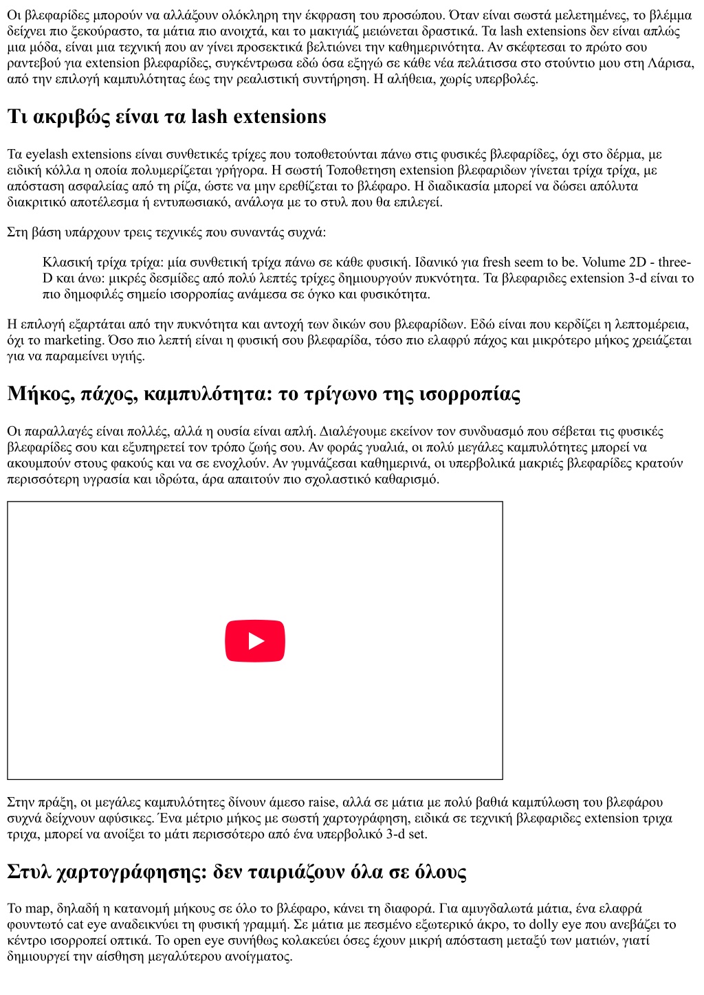 Οι βλεφαρίδες μπορούν να αλλάξουν ολόκληρη την έκφραση του προσώπου. Όταν είναι σωστά μελετημένες, το βλέμμα δείχνει πιο ξεκούραστο, τα μάτια πιο ανοιχτά, και το μακιγιάζ μειώνεται δραστικά. Τα lash extensions δεν είναι απλώς μια μόδα, είναι μια τεχνική που αν γίνει προσεκτικά βελτιώνει την καθημερινότητα. Αν σκέφτεσαι το πρώτο σου ραντεβού για extension βλεφαρίδες, συγκέντρωσα εδώ όσα εξηγώ σε κάθε νέα πελάτισσα στο στούντιο μου στη Λάρισα, από την επιλογή καμπυλότητας έως την ρεαλιστική συντήρηση. Η αλήθεια, χωρίς υπερβολές. Τι ακριβώς είναι τα lash extensions Τα eyelash extensions είναι συνθετικές τρίχες που τοποθετούνται πάνω στις φυσικές βλεφαρίδες, όχι στο δέρμα, με ειδική κόλλα η οποία πολυμερίζεται γρήγορα. Η σωστή Τοποθετηση extension βλεφαριδων γίνεται τρίχα τρίχα, με απόσταση ασφαλείας από τη ρίζα, ώστε να μην ερεθίζεται το βλέφαρο. Η διαδικασία μπορεί να δώσει απόλυτα διακριτικό αποτέλεσμα ή εντυπωσιακό, ανάλογα με το στυλ που θα επιλεγεί. Στη βάση υπάρχουν τρεις τεχνικές που συναντάς συχνά: Κλασική τρίχα τρίχα: μία συνθετική τρίχα πάνω σε κάθε φυσική. Ιδανικό για fresh seem to be. Volume 2D - three- D και άνω: μικρές δεσμίδες από πολύ λεπτές τρίχες δημιουργούν πυκνότητα. Τα βλεφαριδες extension 3-d είναι το πιο δημοφιλές σημείο ισορροπίας ανάμεσα σε όγκο και φυσικότητα. Η επιλογή εξαρτάται από την πυκνότητα και αντοχή των δικών σου βλεφαρίδων. Εδώ είναι που κερδίζει η λεπτομέρεια, όχι το marketing. Όσο πιο λεπτή είναι η φυσική σου βλεφαρίδα, τόσο πιο ελαφρύ πάχος και μικρότερο μήκος χρειάζεται για να παραμείνει υγιής. Μήκος, πάχος, καμπυλότητα: το τρίγωνο της ισορροπίας Οι παραλλαγές είναι πολλές, αλλά η ουσία είναι απλή. Διαλέγουμε εκείνον τον συνδυασμό που σέβεται τις φυσικές βλεφαρίδες σου και εξυπηρετεί τον τρόπο ζωής σου. Αν φοράς γυαλιά, οι πολύ μεγάλες καμπυλότητες μπορεί να ακουμπούν στους φακούς και να σε ενοχλούν. Αν γυμνάζεσαι καθημερινά, οι υπερβολικά μακριές βλεφαρίδες κρατούν περισσότερη υγρασία και ιδρώτα, άρα απαιτούν πιο σχολαστικό καθαρισμό. Στην πράξη, οι μεγάλες καμπυλότητες δίνουν άμεσο raise, αλλά σε μάτια με πολύ βαθιά καμπύλωση του βλεφάρου συχνά δείχνουν αφύσικες. Ένα μέτριο μήκος με σωστή χαρτογράφηση, ειδικά σε τεχνική βλεφαριδες extension τριχα τριχα, μπορεί να ανοίξει το μάτι περισσότερο από ένα υπερβολικό 3-d set. Στυλ χαρτογράφησης: δεν ταιριάζουν όλα σε όλους Το map, δηλαδή η κατανομή μήκους σε όλο το βλέφαρο, κάνει τη διαφορά. Για αμυγδαλωτά μάτια, ένα ελαφρά φουντωτό cat eye αναδεικνύει τη φυσική γραμμή. Σε μάτια με πεσμένο εξωτερικό άκρο, το dolly eye που ανεβάζει το κέντρο ισορροπεί οπτικά. Το open eye συνήθως κολακεύει όσες έχουν μικρή απόσταση μεταξύ των ματιών, γιατί δημιουργεί την αίσθηση μεγαλύτερου ανοίγματος.