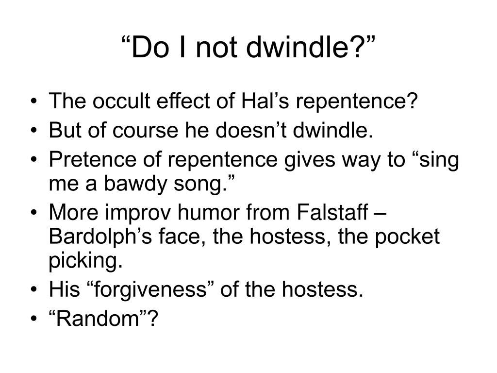 “Do I not dwindle?” • The occult effect of Hal’s repentence? • But of course he doesn’t dwindle. • Pretence of repentence gives way to “sing me a bawdy song.” • More improv humor from Falstaff – Bardolph’s face, the hostess, the pocket picking. • His “forgiveness” of the hostess. • “Random”?