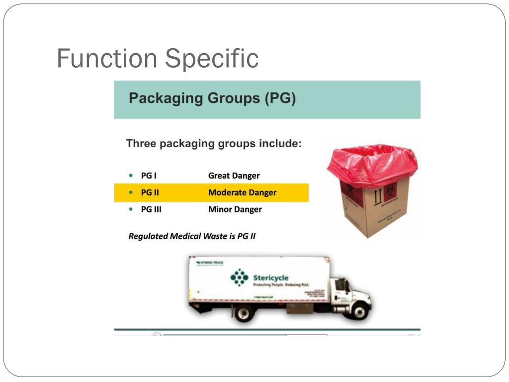 Function Specific Improperly prepared containers should never be accepted for transportation under any circumstance. Examples of unacceptable packaging are: Leaking containers, protruding objects, improperly closed containers, overfilling and mislabeled containers. • Packaging Regulated Medical Waste (RMW)