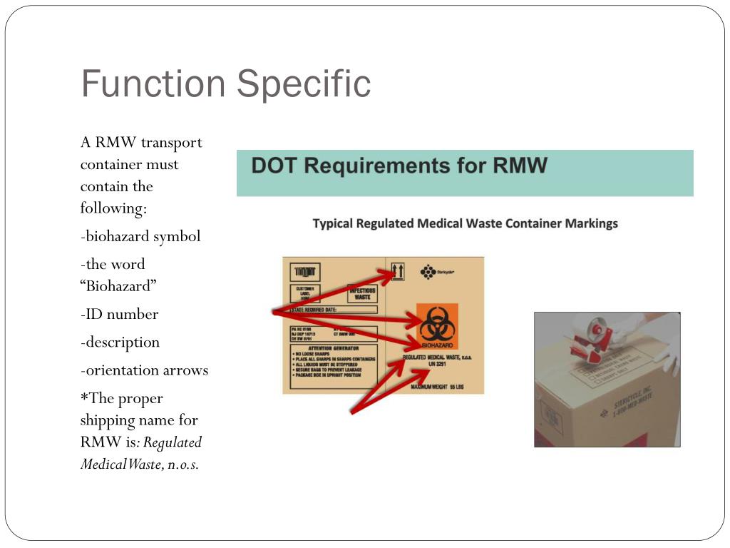 Function Specific A RMW transport container must contain the following: -biohazard symbol -the word “Biohazard” -ID number -description -orientation arrows *The proper shipping name for RMW is: Regulated Medical Waste, n.o.s.