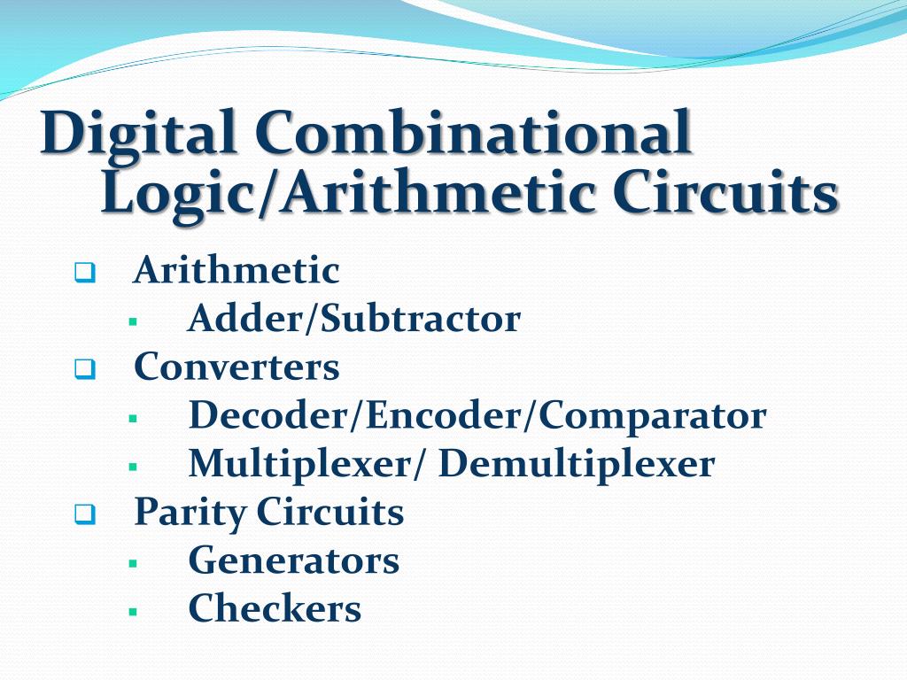 Digital Combinational Logic/Arithmetic Circuits • Arithmetic • Adder/Subtractor • Converters • Decoder/Encoder/Comparator • Multiplexer/ Demultiplexer • Parity Circuits • Generators • Checkers