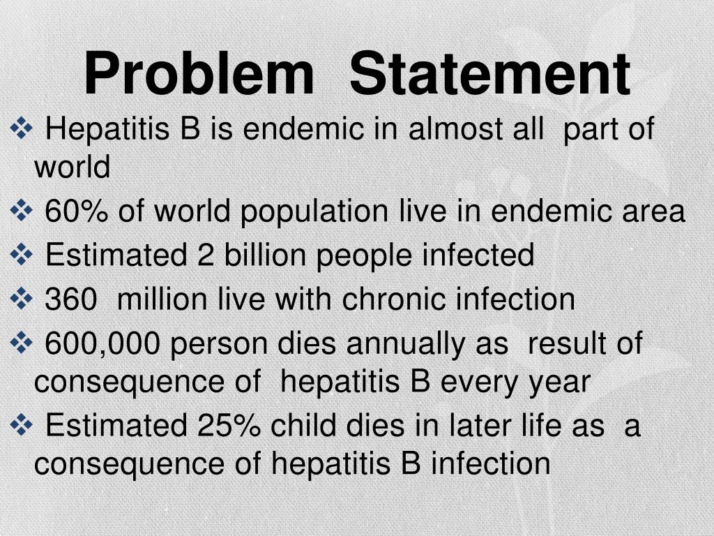 Problem Statement • Hepatitis B is endemic in almost all part of world • 60% of world population live in endemic area • Estimated 2 billion people infected • 360 million live with chronic infection • 600,000 person dies annually as result of consequence of hepatitis B every year • Estimated 25% child dies in later life as a consequence of hepatitis B infection