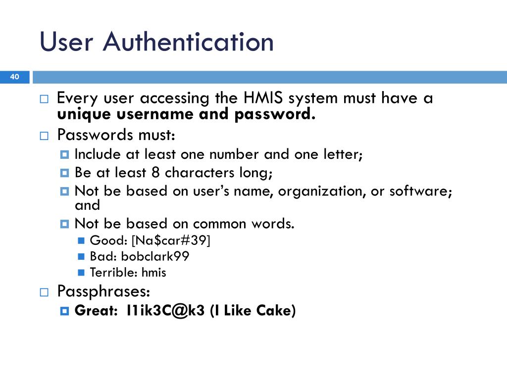 User Authentication • Every user accessing the HMIS system must have a unique username and password. • Passwords must: • Include at least one number and one letter; • Be at least 8 characters long; • Not be based on user’s name, organization, or software; and • Not be based on common words. • Good: [Na$car#39] • Bad: bobclark99 • Terrible: hmis • Passphrases: • Great: I1ik3C@k3 (I Like Cake)