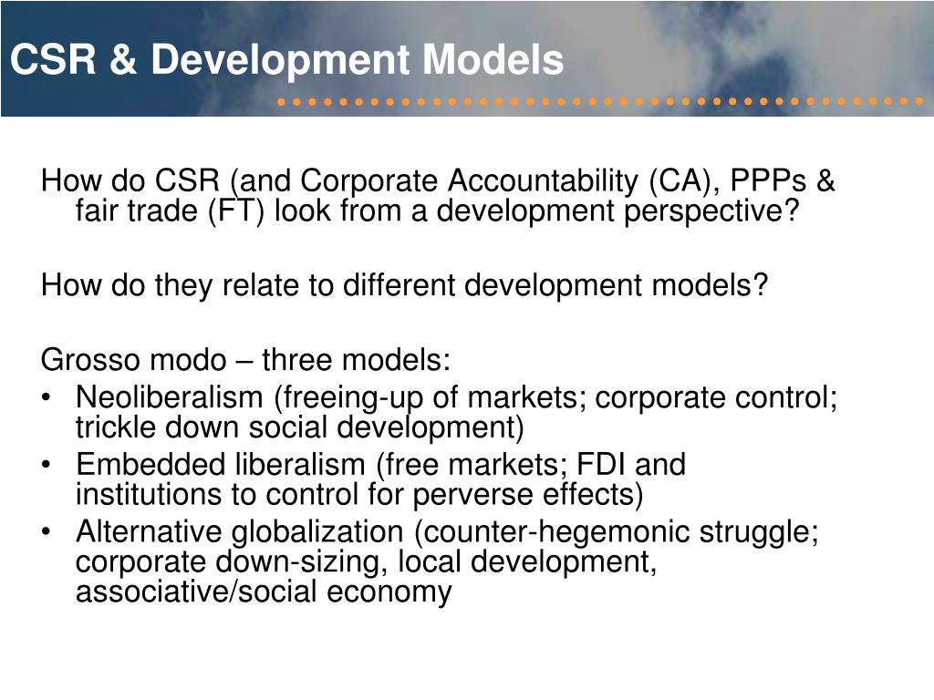 CSR & Development Models How do CSR (and Corporate Accountability (CA), PPPs & fair trade (FT) look from a development perspective? How do they relate to different development models? Grosso modo – three models: • Neoliberalism (freeing-up of markets; corporate control; trickle down social development) • Embedded liberalism (free markets; FDI and institutions to control for perverse effects) • Alternative globalization (counter-hegemonic struggle; corporate down-sizing, local development, associative/social economy