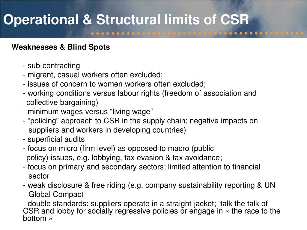 Operational & Structural limits of CSR Weaknesses & Blind Spots - sub-contracting - migrant, casual workers often excluded; - issues of concern to women workers often excluded; - working conditions versus labour rights (freedom of association and collective bargaining) - minimum wages versus “living wage” - “policing” approach to CSR in the supply chain; negative impacts on suppliers and workers in developing countries) - superficial audits - focus on micro (firm level) as opposed to macro (public policy) issues, e.g. lobbying, tax evasion & tax avoidance; - focus on primary and secondary sectors; limited attention to financial sector - weak disclosure & free riding (e.g. company sustainability reporting & UN Global Compact - double standards: suppliers operate in a straight-jacket; talk the talk of CSR and lobby for socially regressive policies or engage in « the race to the bottom »