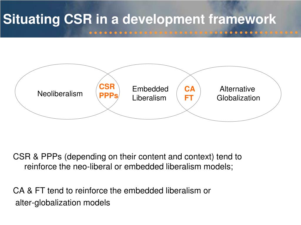 Situating CSR in a development framework Embedded Liberalism Alternative Globalization Neoliberalism CSR PPPs CA FT CSR & PPPs (depending on their content and context) tend to reinforce the neo-liberal or embedded liberalism models; CA & FT tend to reinforce the embedded liberalism or alter-globalization models